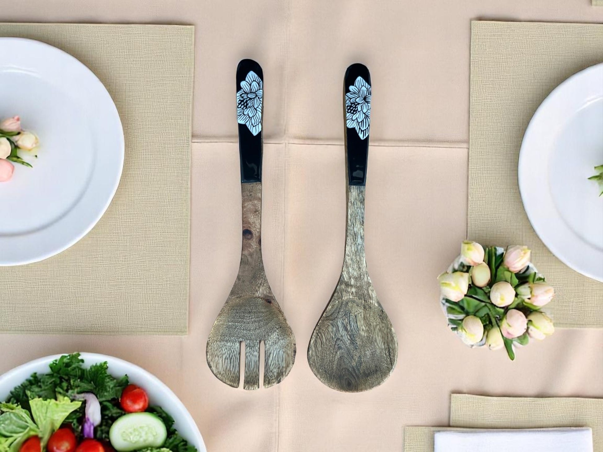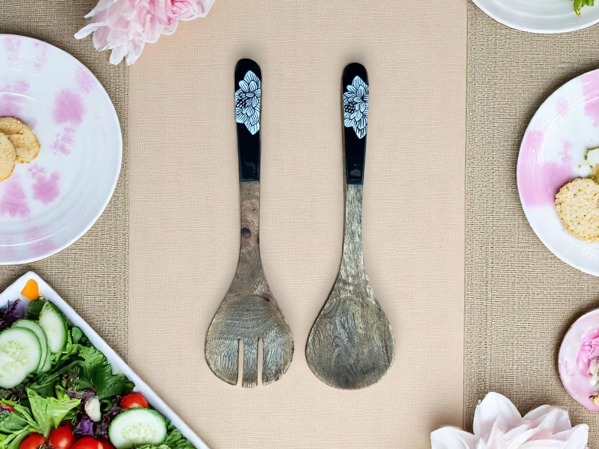 Elevate your dining experience with the Padma wooden salad server set of 2, exclusively at Loklore. Rooted in the symbolism of purity and tranquility, the Padma Wooden Salad Server Set draws inspiration from the lotus flower—an emblem of grace and resilience. This exquisite set of two is handcrafted from premium mango wood, blending traditional artistry with modern sophistication. The monochrome floral detailing adds a timeless charm, making it a refined addition to your dining experience.